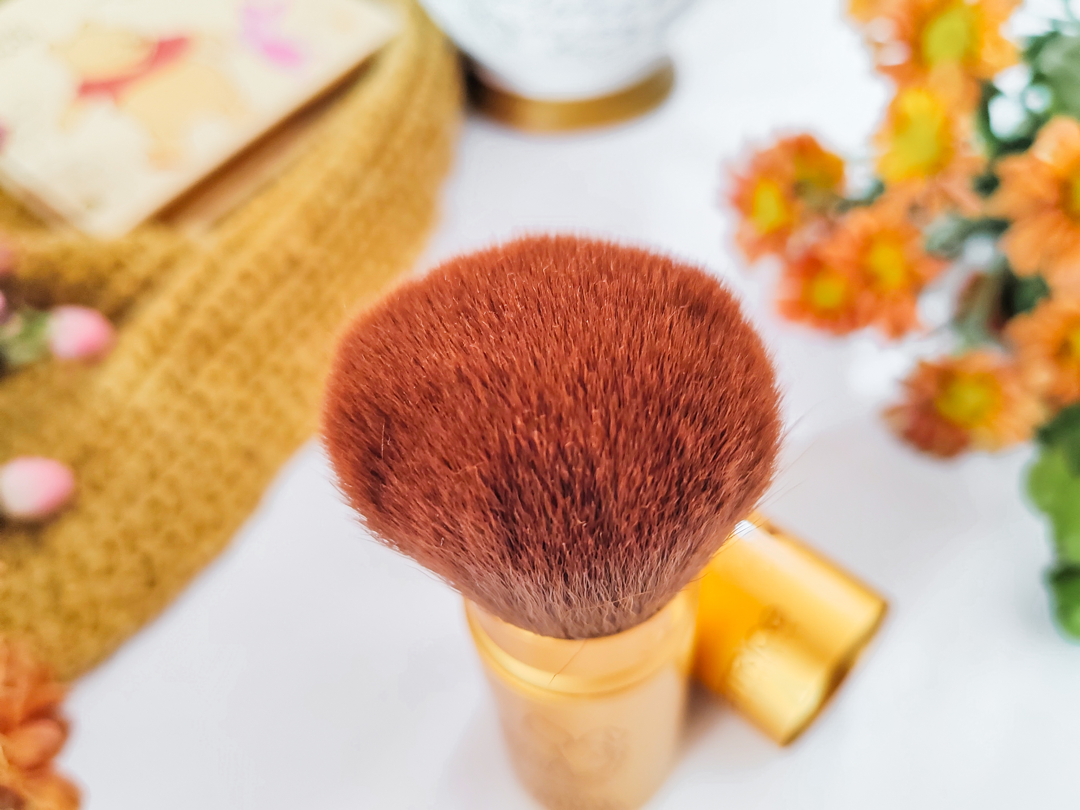 Štětec je skvělý hlavně na cesty díky praktickému balení. Tyhle štětce už úplně kdysi používala mamča, pamatuji si je z dětství a jakmile někde natrefím právě na zatahovací balení, ihned mě zalije vlna nostalgie. Tím, že se dá stáhnout, má víčko, tak při cestování neničíte štětiny. Ta jsou měkká, velmi hustá, takže fajn třeba na pudry, bronzery.